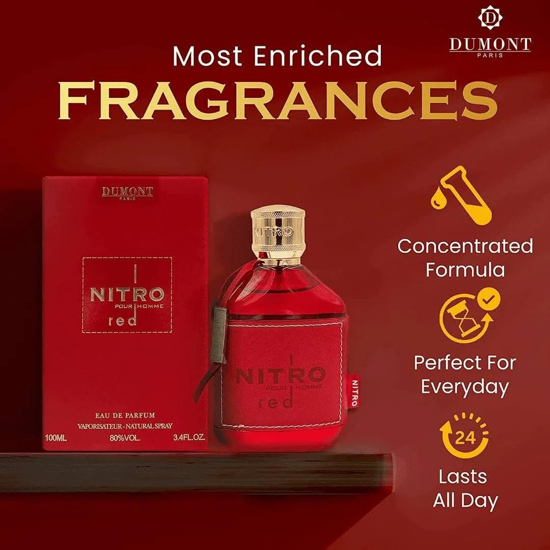 Buy Dumont Nitro Red For Men Online in India at best price from Aar Fragrances. Dumont Nitro Red Eau De Parfum for Men.This bold and daring scent will leave you feeling confident and ready to take on the day. With its unique blend of notes, it's the perfect choice for the man who likes to stand out from the crowd.