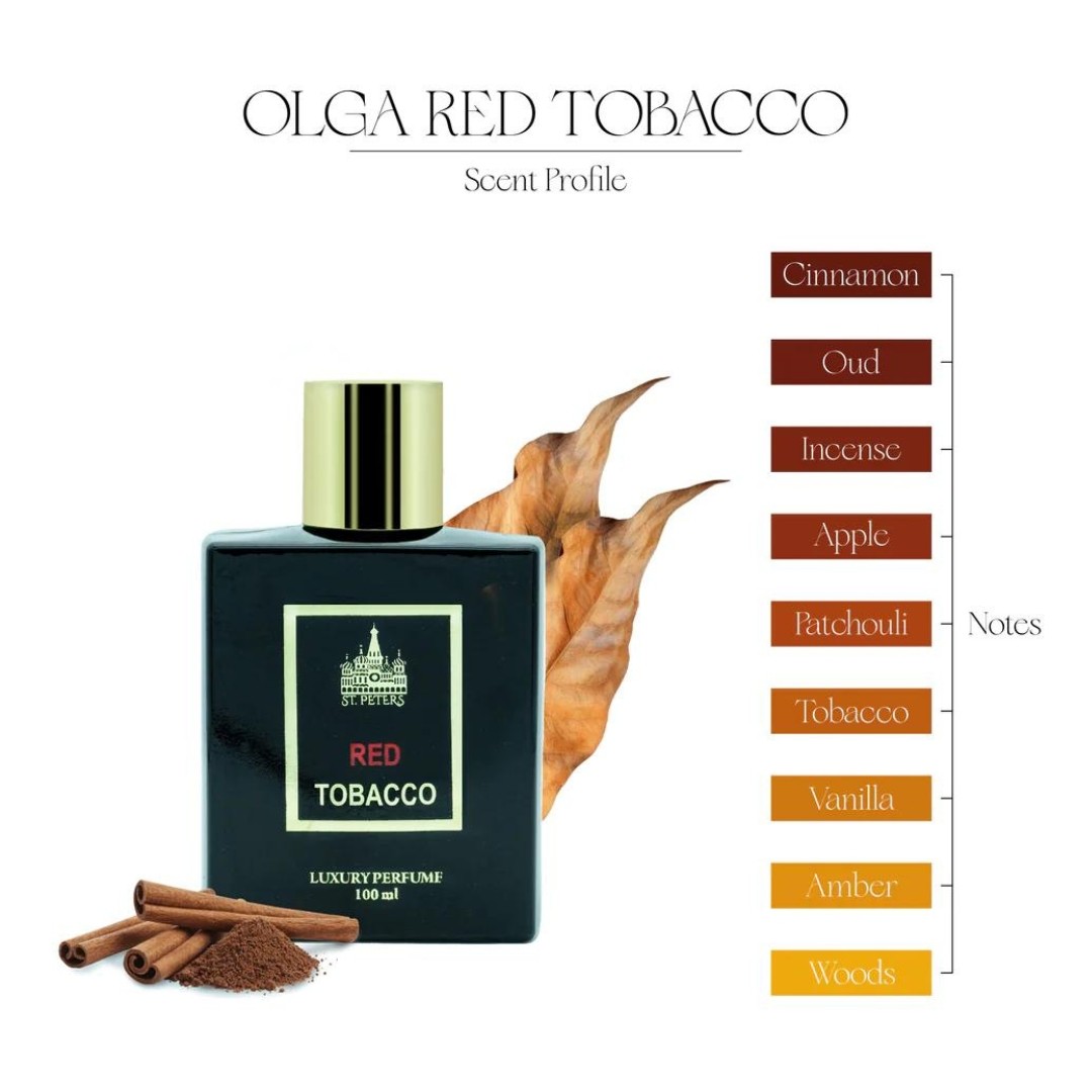 Buy Olga ST.Peter Red Tobacco Online in India at best price from Aar Fragrances. Olga Red Tobacco smells like sweet, dry tobacco with creamy and woody nuances. Firstly, Red Tobacco contains notes of cinnamon, oud, incense, apple, patchouli, tobacco, vanilla, amber, and woods.